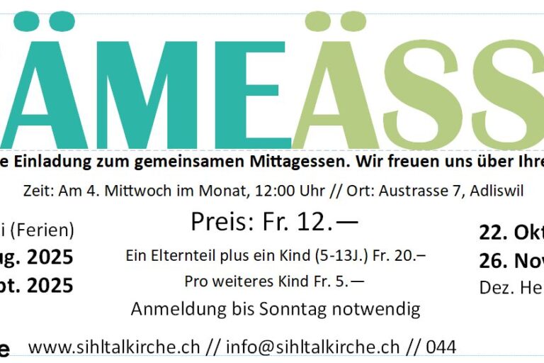 Auch in der zweiten Jahreshälfte gibt es wieder die Gelegenheit zum ZÄMEÄSSE. Das monatlichen Mittagessen kostet nur Fr. 12.–. Weitere Infos und Daten siehe Flyer Zämeässe 25a Zeit: Am 4. Mittwoch im Monat, 12:00 Uhr // Ort: Sihltal Kirche, Austrasse 7 Preis: Fr. 12.— (Ein Elternteil plus ein Kind 5-13J. Fr. 20.–) Jedes weiteres Kind Fr.…